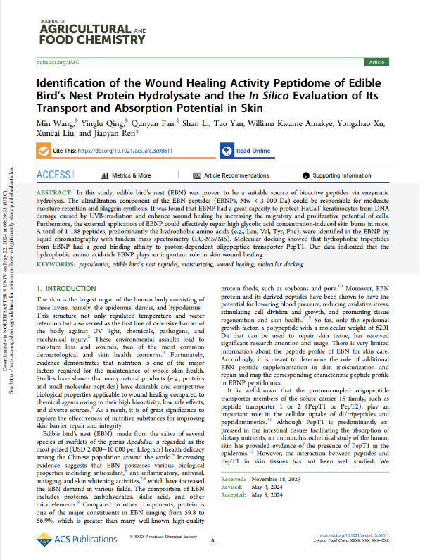 此次燕之屋“Identification of the Wound Healing Activity Peptidome of Edible Bird's Nest Protein Hydrolysate and the In Silico Evaluation of Its Transport and Absorption Potential in Skin”科研成果被食品科學(xué)領(lǐng)域國際權(quán)威期刊《Journal of Agricultural and Food Chemistry》收錄,進一步彰顯燕之屋學(xué)術(shù)實力與科研水平。該科研成果具有科學(xué)性、創(chuàng)新性和前沿性,不僅展示了燕之屋對燕窩肽的研究和理解深度,更促進燕窩肽的開發(fā)和利用,將推動燕窩行業(yè)的科學(xué)研究和產(chǎn)品創(chuàng)新。燕之屋持續(xù)深耕科研工作,未來也將不斷挖掘、開發(fā)燕窩營養(yǎng)價值,為國民健康高品質(zhì)生活助力。
