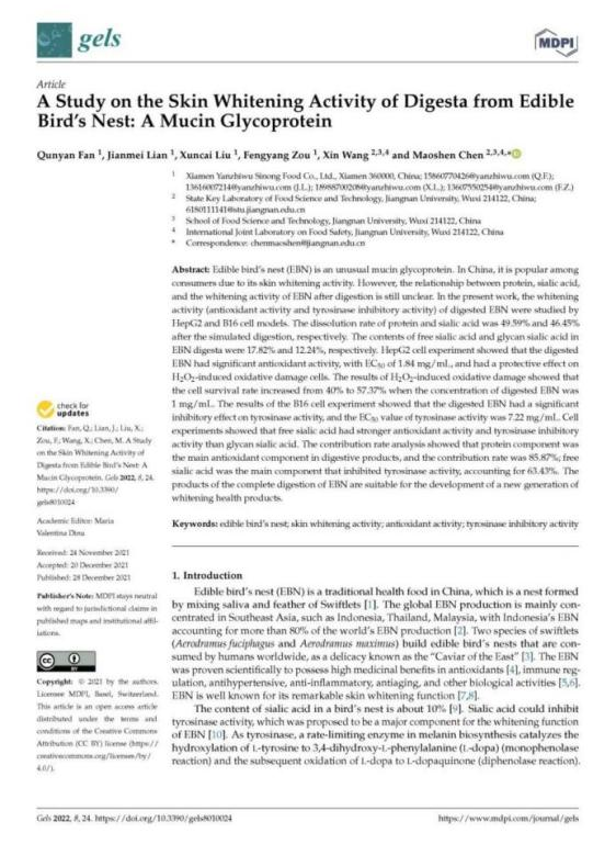 燕之屋潛心燕窩肽研究,成立燕之屋燕窩肽研究中心,聚焦燕窩肽酶解技術(shù)、活性成分與功能研究等多方向賽道,近年來不斷取得突破,成果斐然。2021年,燕之屋燕窩研究院和江南大學(xué)食品科學(xué)與技術(shù)國家重點實驗室聯(lián)合完成研究成果“A study on the skin whitening activity of digesta from edible bird's nest: A mucin glycoprotein”,發(fā)布于權(quán)威學(xué)術(shù)性期刊《Gels》;2022年,燕之屋燕窩研究院攜手香港科技大學(xué)攜手完成燕窩肽抗皮膚炎癥功能研究,專業(yè)研究成果“Edible bird’s nest, an Asian health food supplement, possesses anti-inflammatory responses in restoring the symptoms of atopic dermatitis: An analysis of signaling cascades”發(fā)布于權(quán)威學(xué)術(shù)性期刊《Frontiers in Pharmacology》;2023年,燕之屋燕窩研究院通過體外生化、細胞、生物三維立體證實了燕窩肽的抗衰老功效,并在國際權(quán)威期刊《Journal of Functional Foods》發(fā)表了燕窩肽抗衰研究"Study of the antiaging effects of bird's nest peptide based on biochemical, cellular, and animal models",揭示燕窩肽抗衰老功效,再一次為燕窩肽的研究發(fā)展貢獻有利價值。近日,燕之屋“一種具有促進細胞修護、高保濕美白功效的燕窩肽制備方法及應(yīng)用”獲得國家知識產(chǎn)權(quán)局發(fā)明專利授權(quán)(專利號:ZL 2022 1 1398048.3),充分證明燕之屋在燕窩肽領(lǐng)域的引領(lǐng)地位。